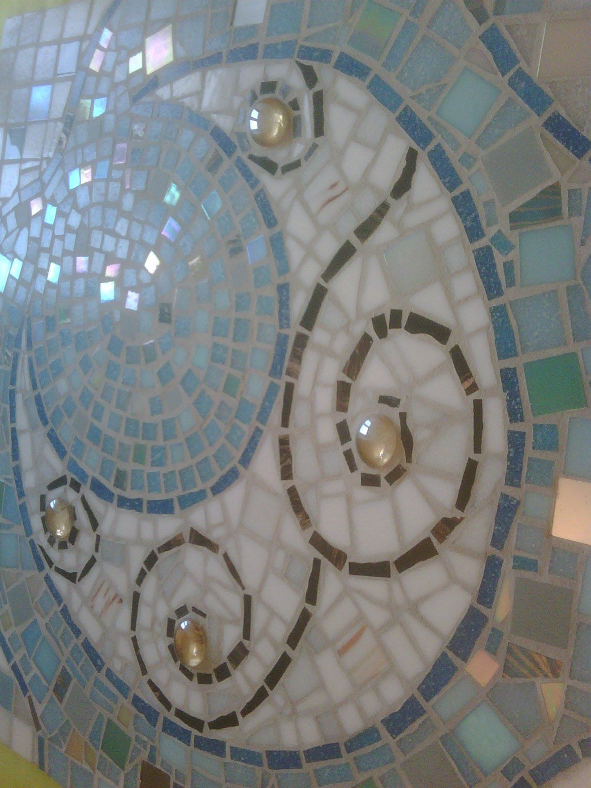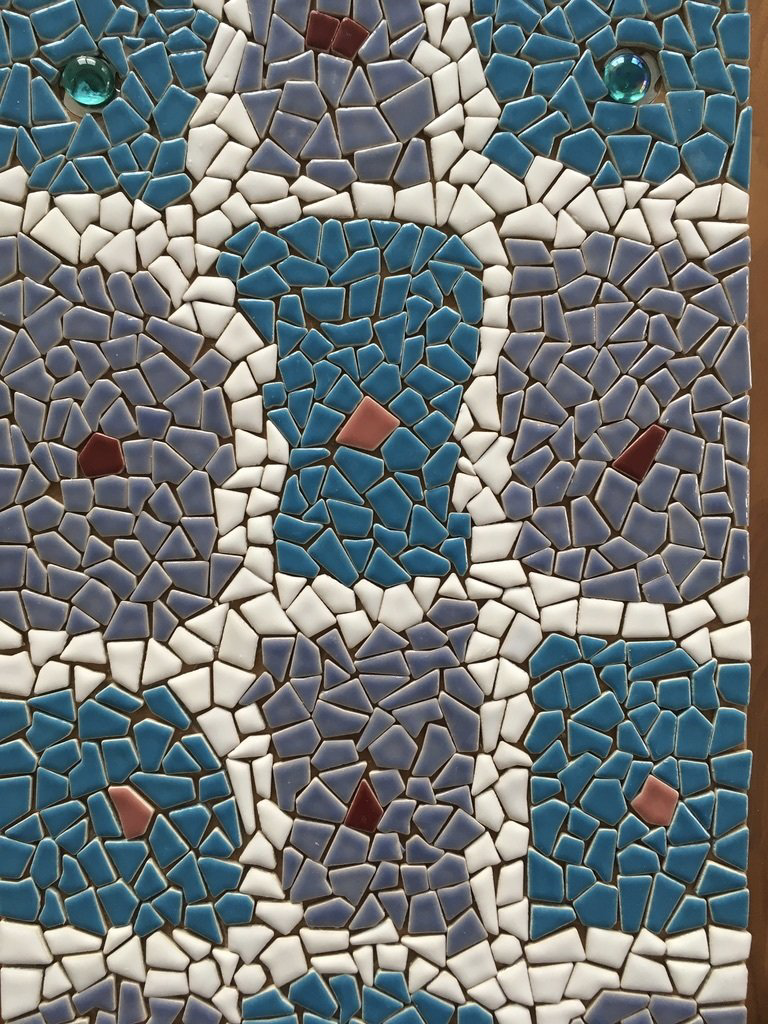 Dazu kommen da die Handwerksarbeiten, wenn man mit Fliesenkleber und Fugenmasse und allerlei Instrumentarium, das sich Spachtel, Modelliereisen oder Fugengummi nennt, beginnt, die Steine zu fixieren. Die rohe Behandlung des eben gesetzten Werkes mit zäher Masse tut in der Seele weh. Die Spannung darüber, was am Ende rauskommt, ist kaum auszuhalten. Schon mancher Versuch, in Ungeduld das Mosaik noch vor dem Austrocknen des Materials als Fertig zu erachten, endete in seiner Beschädigung. Ist die Geduld auf meiner Seite, können Überraschungen perfekt sein und das fertige Mosaik ist wunderschön geworden und kann seine Bestimmung aufnehmen.