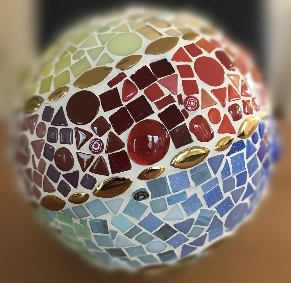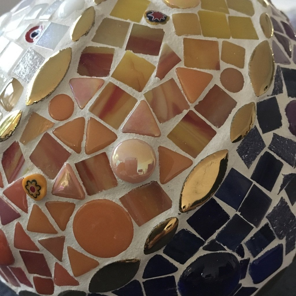 Was am Ende herauskommt, ist ein Gebilde, das in unzähligen Arbeitsschritten geformt wurde und das herrlich unperfekt ist. Es ist zerstückelt, besprenkelt, manchmal etwas scharfkantig, manchmal glatt wie ein Handschmeichler und oft fehlt noch ein passender Rahmen für das perfekte Finish! Aber das was plötzlich da ist, hat aus einer braunen Tonkugel eine leuchtende Gartenkugel gemacht, aus einem alten ausrangierten Holzspiegel einen Rahmen, in dem man sein Gesicht gerne anschaut und aus einer grauen Terrassenfliese ein buntes Quadrat, bei dem man innehält, statt draufzutreten.
