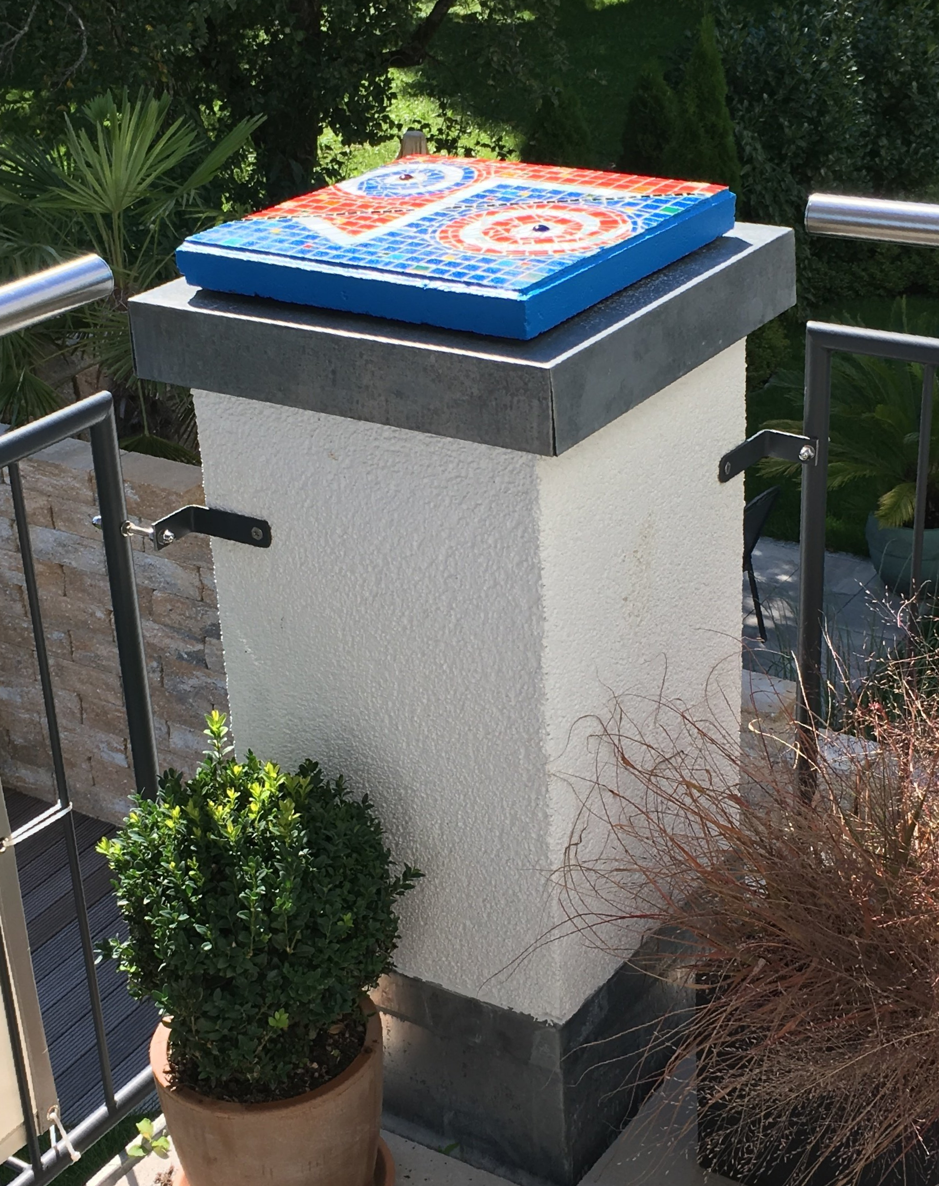 ButtonMosaike erfreuen und pflegen auch die gute Nachbarschaft. Von der Terrasse über uns wird immer wieder ein Blick nach unten auf das Bunte geworfen und der Plausch startet…..